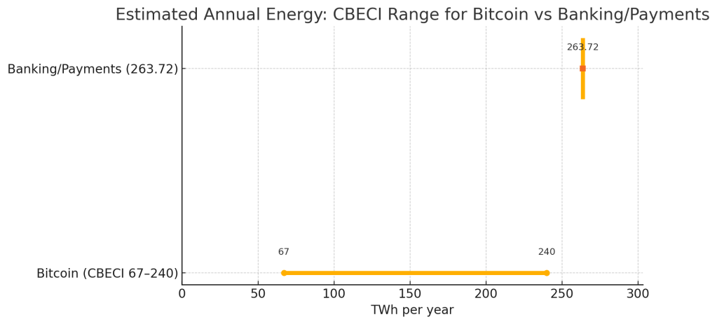 - Energi tahunan sistem perbankan / payments (global, agregat): ≈263.72 TWh/yr (studi komparatif yang sering dikutip — banking + infrastruktur pembayaran). NasdaqCointelegraph